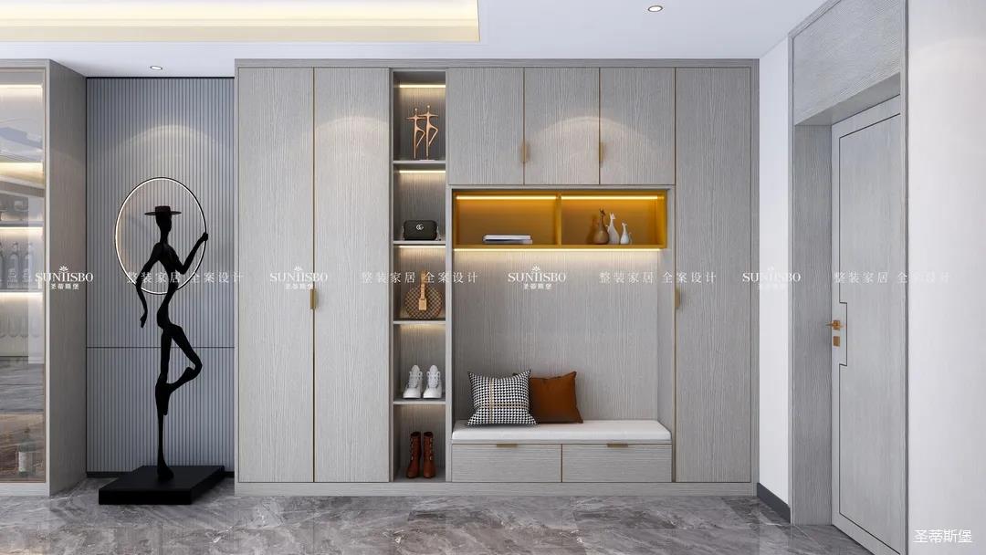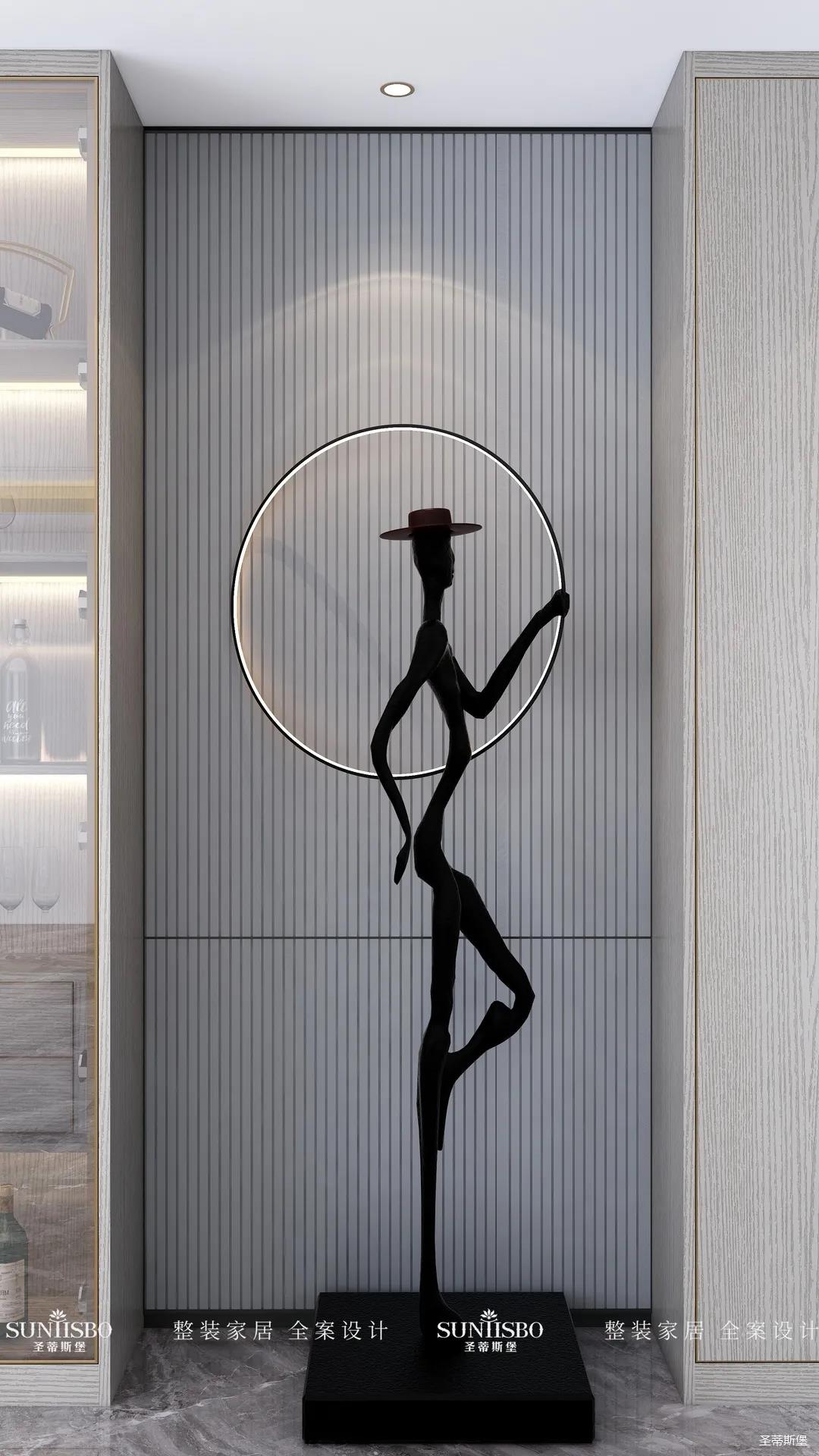 造型獨特的人形裝飾佇立在過道與玄關之間,充滿優(yōu)雅氣息。淺灰的線性紋理背景搭配黑色的造型,彰顯著居者時尚的生活品位。
