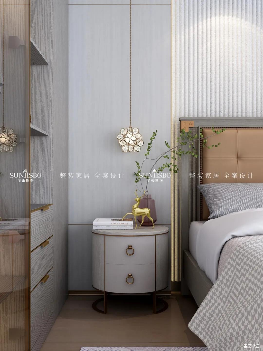 精于思而展于型,主臥將浮華的裝飾剔除,裝飾線連接各個區(qū)域,強調了空間的節(jié)奏與韻律。運用時尚灰大面積展現(xiàn)著高級感,讓不同色彩的家具結合,營造出與眾不同的韻感與雅致,給人良好的睡眠體驗。