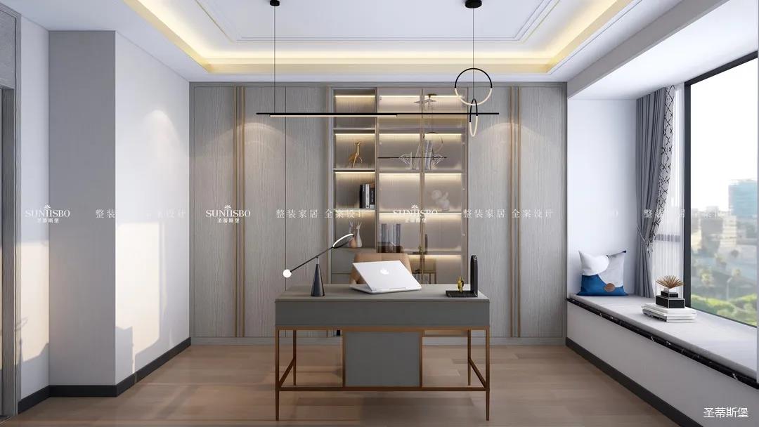 業(yè)主鐘愛閱讀,設計師將其中一間房打造為書房,設計的風格從布局到陳列,從色調到材質,都能給人一種優(yōu)雅從容的感受。讓業(yè)主在繁忙的生活中,有一處能夠讓人靜心的空間品茶閱讀。