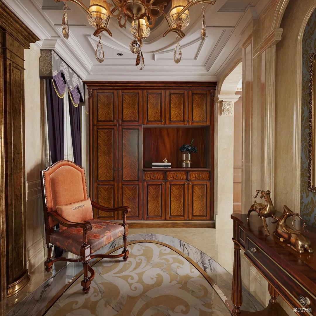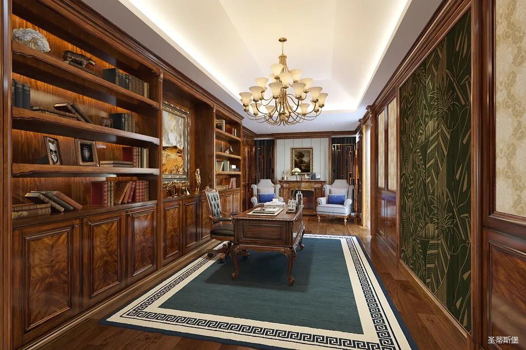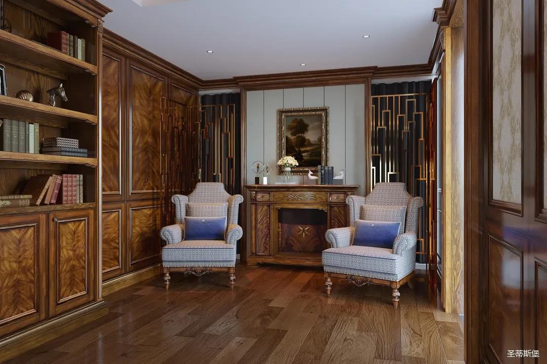 邁進書房,仿佛就來到另一個清麗的世界,拋開身后的塵囂,恍如隔世般撫慰著辛勞一天的身心。每一物件都經過設計師的精雕細琢,不管是布藝的紋理,木質的雕飾,亦或是真皮的質感,都讓大美的豪華一目了然。粗狂中透著柔美的線條,渾厚復古的色調,讓空間顯得深沉而含蓄,置身其中即可感受到傳統的歷史痕跡與渾厚的文化底蘊。