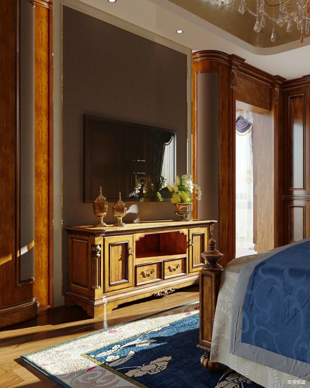 主臥整體設計是美式與現代的完美整合,既保留了純正美式的形和實木雕刻藝術,又具有濃重的美式配色,濃濃的藝術氣息不自覺在浪漫的美式空間流淌。流暢的弧線花飾以及豐富的木作線條別具匠心。大氣穩重與舒適雅致并重,并借由開放的布局、靈活的動線,共同促成了整個空間極具復古浪漫的情調。