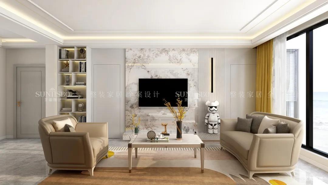 客廳設計置頂展示柜和大理石,實現了現代和輕奢風格間的均衡組合。溫柔莫蘭迪色調的沙發,細節的實木底座和人性化的環抱式設計讓空間更添溫馨的氣息。